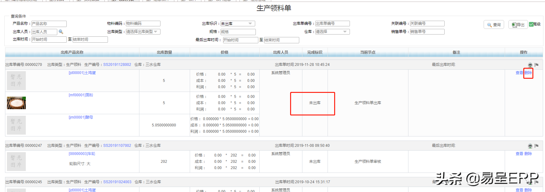 此处要注意生产领料单删除的操作,只有是未出库的领料单才能进行删除,如已出库的单据是不能够删除的,只能进行查看