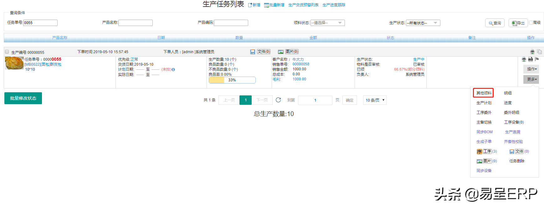 生产其他领料的操作在 生产管理--生产任务管理--找到对应生产任务单--更多按钮 内进行操作,
