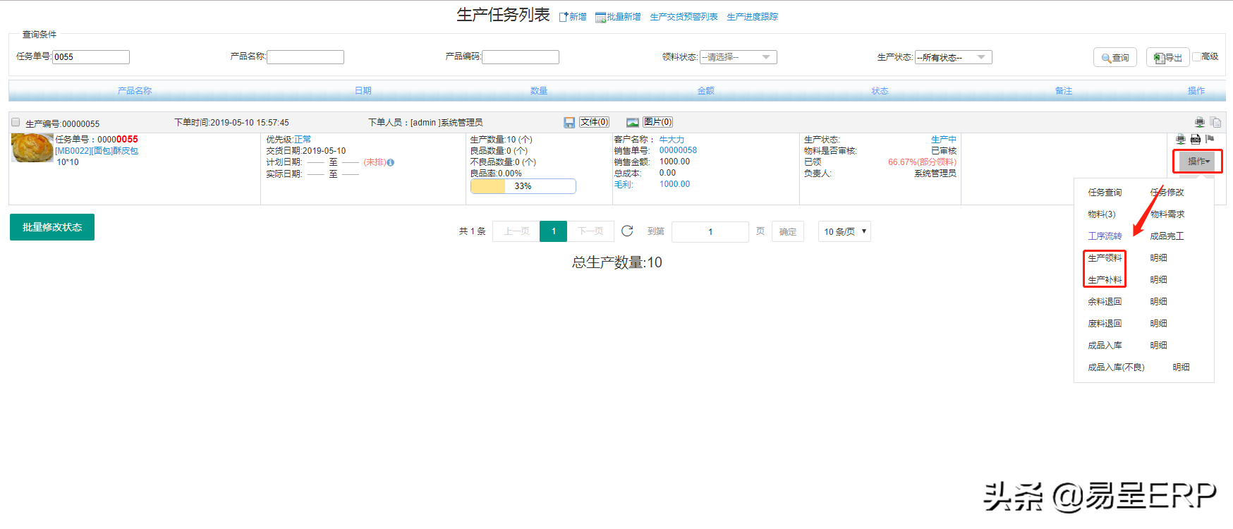 在 生产管理--生产任务管理--找到对应生产任务单--操作按钮,去进行领料、补料的操作