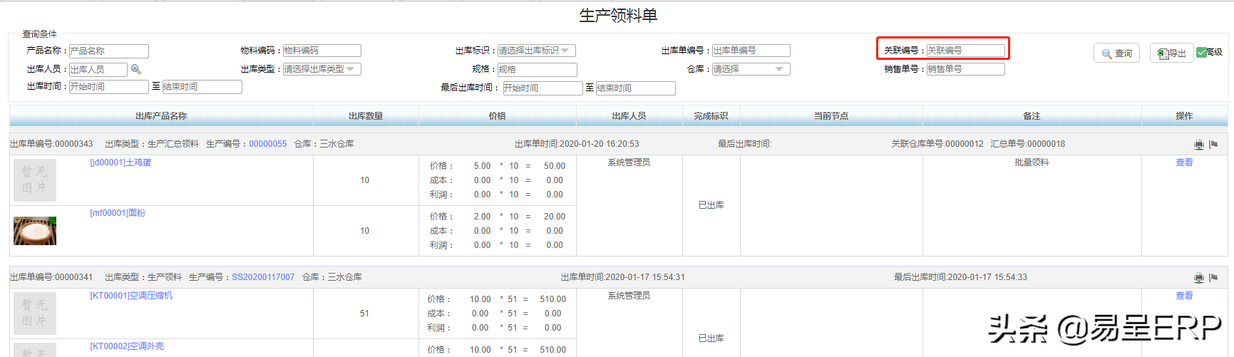 这里数据的显示主要来源于生产单操作 领料、补料、其他领料等操作。