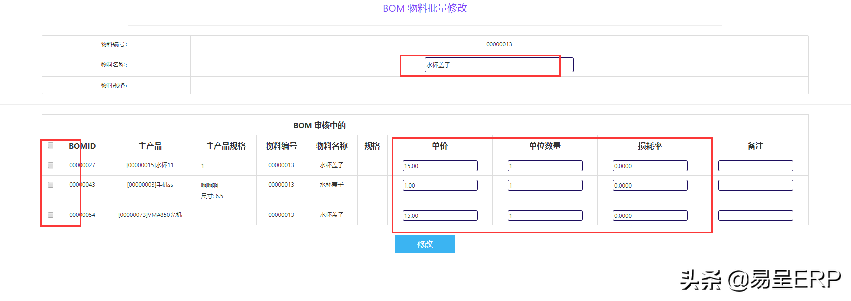 无锡易呈erp外协委外生产管理系统的BOM物料如何批量修改?
