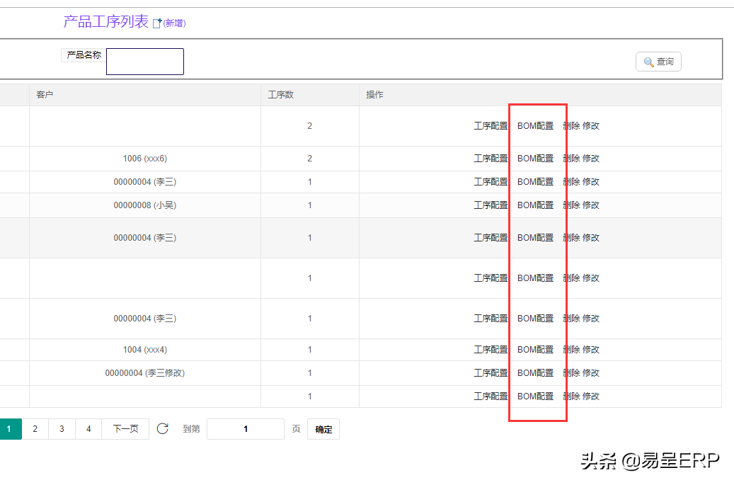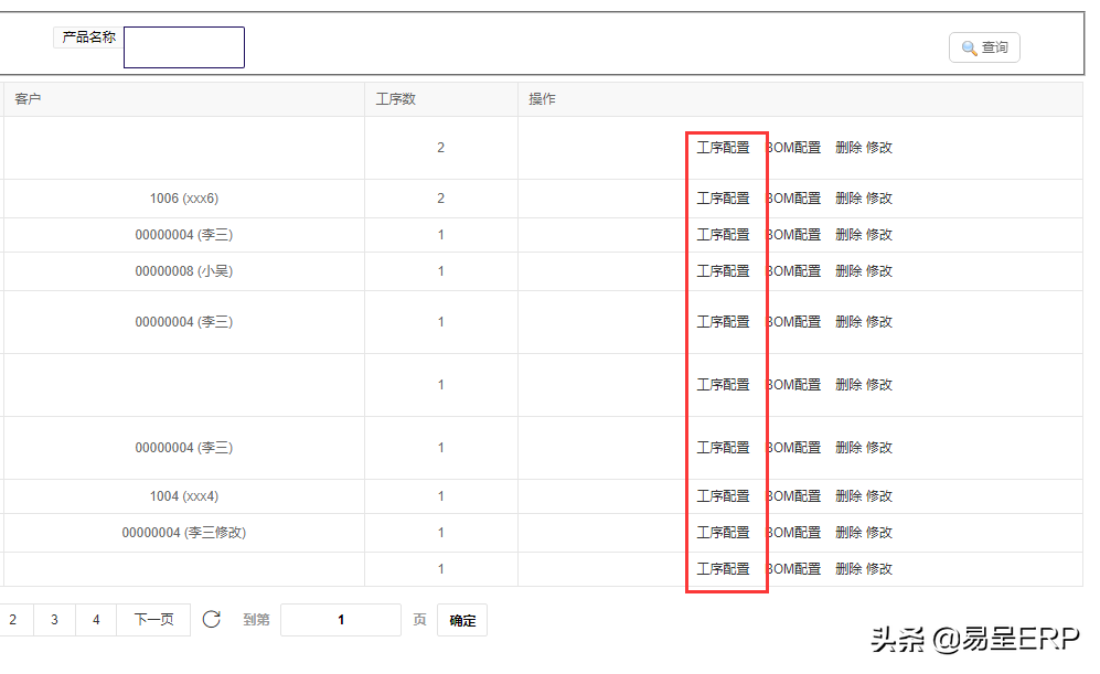 二.工序配置,可以根据产品进行配置相应的工序,新增或者修改删除产品工序(可以直接用于bom表中)