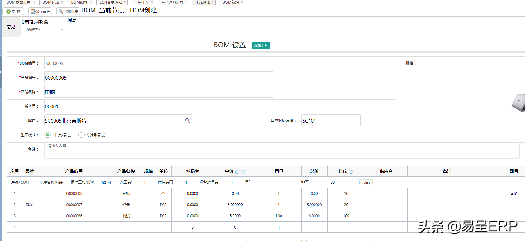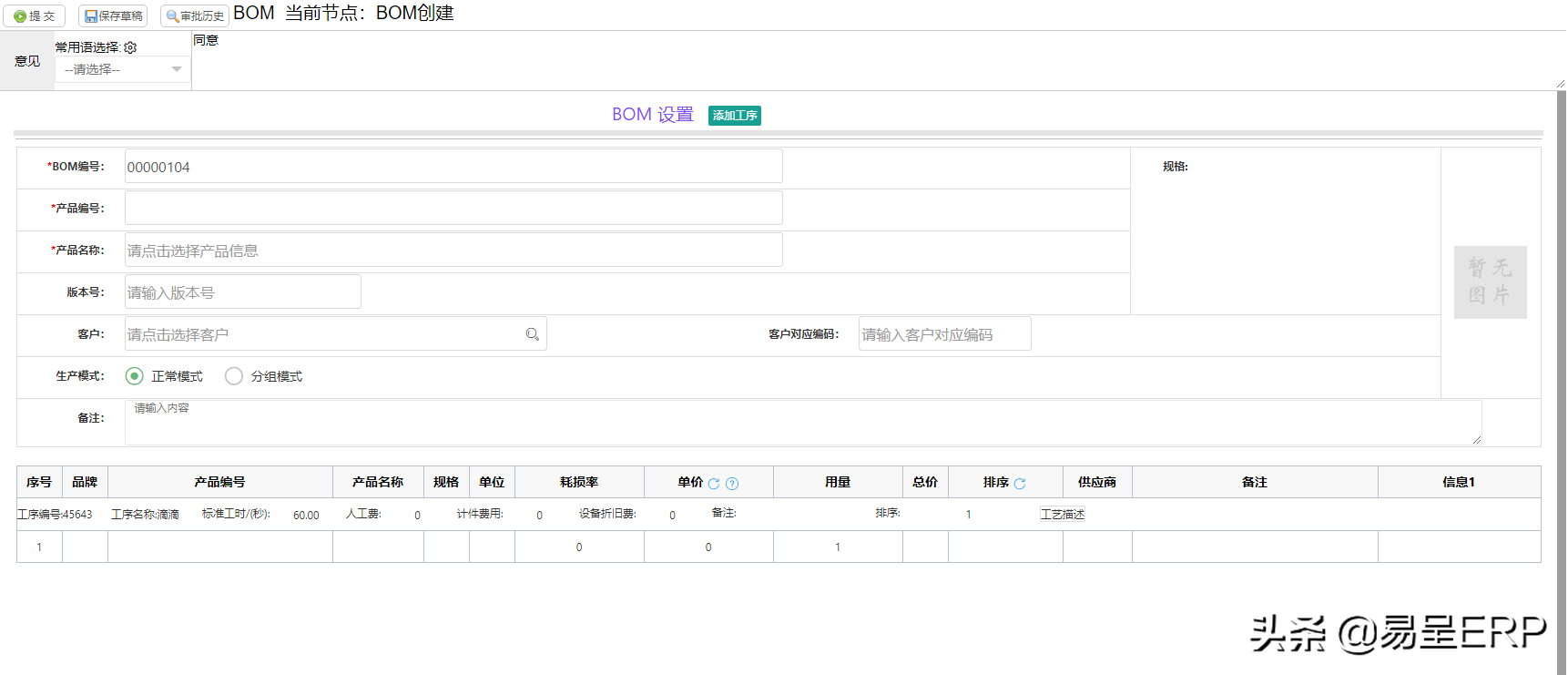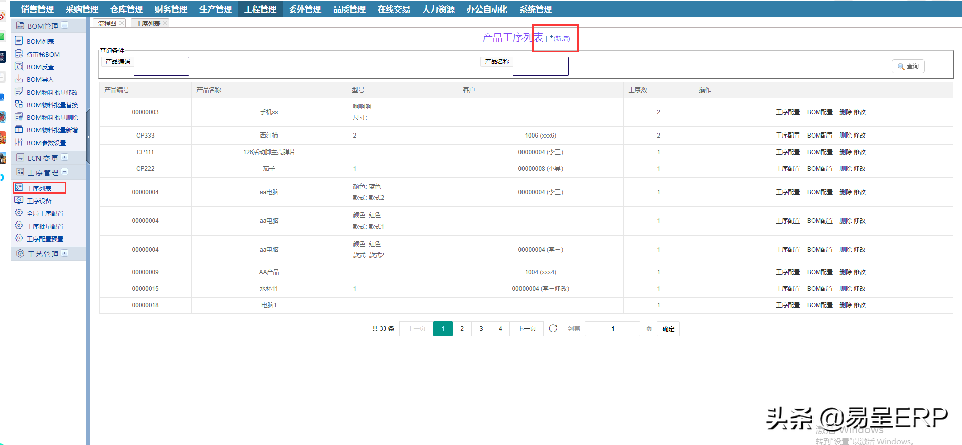 一.bom新增,在这里也可以新增某个成品的BOM表,然后再进行对应的工序配置,也可以到BOM列表中去新增,必须要有BOM表才能工序配置的操作。