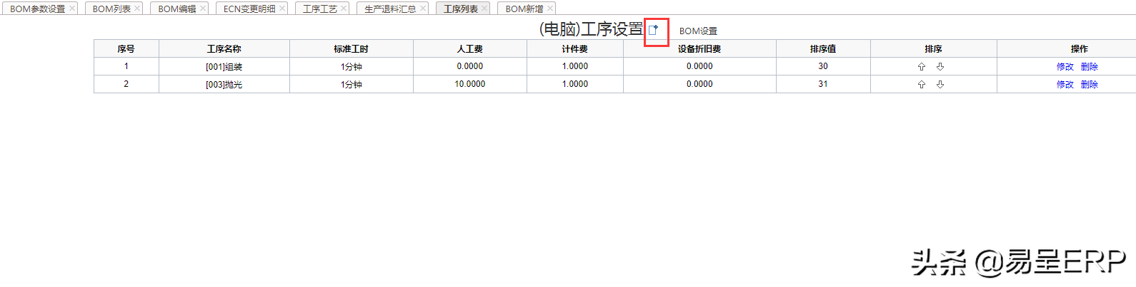 工序列表对于建立BOM表的产品进行配置工序以及修改相应BOM