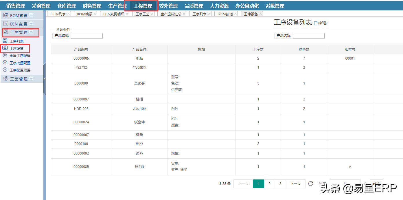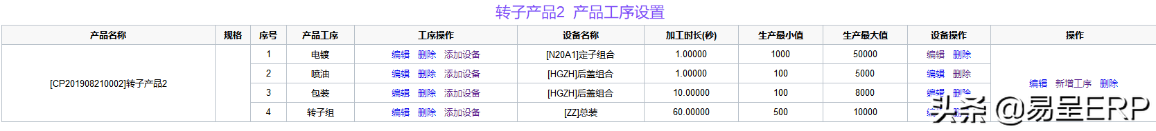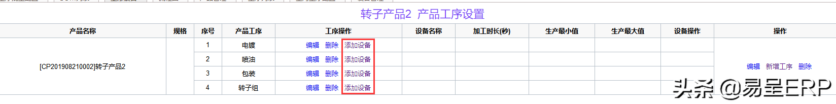 根据不同的产品的工序配置工序所需的设备,这里也用于自动排产,自动排产是精确到要生产某款产品,这款产品用到哪些工序,这些工序用到哪些设备机器,或者是指这些工序在哪些设备上进行工作,这里的工序设备编辑,仅针对于有BOM的产品去进行设置,如果没有的话就需要先在BOM列表新增后再编辑工序设备。